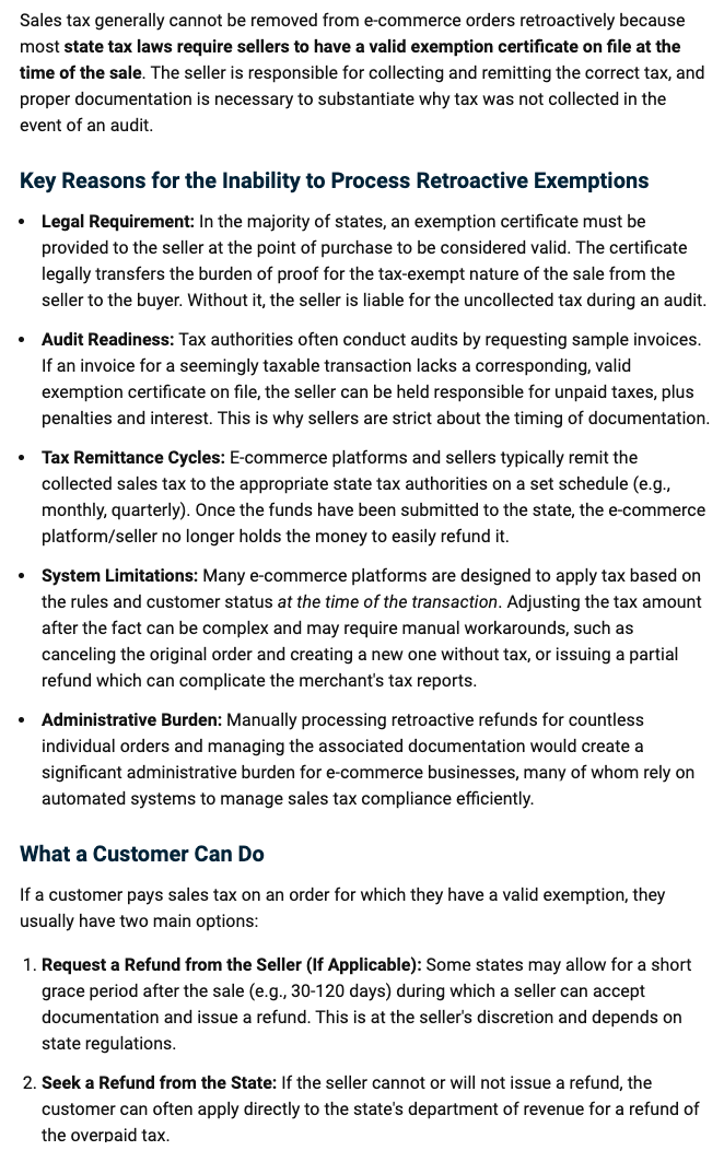 Once an order is placed, we cannot legally, and therefore technologically, have tax retroactively removed from it. The tax will have to be paid, and applied for a refund from your state after-the-fact.